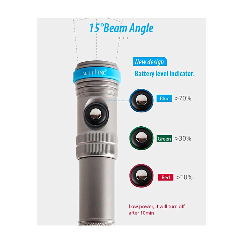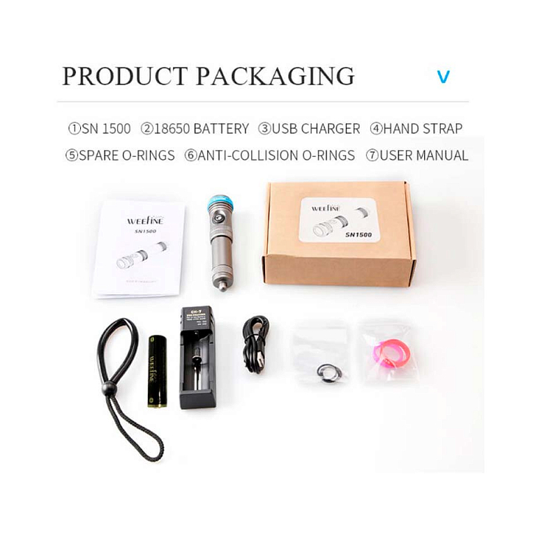 SN 1500 основан на базе Smart Focus 1200 с совершенно новой концепцией дизайна WEEFINE, которая выглядит стильно, модно благодаря использованию корпуса из черного алюминиевого сплава с жесткой оксидной обработкой. Наибольшая яркость подводного фонаря составляет до 1500 люмен. Кольцевой индикатор нанесен на фонарик с кнопочным управлением из нержавеющей стали, индикатор информирует нас о состоянии заряда аккумулятора: синий: >70%, зеленый: >30%, красный: >10%. Вы можете регулировать мощность света между тремя уровнями: 100%, 50% и 25%. Раскрывающийся луч имеет 15º, что даёт хороший угол обзора. Время работы WEEFINE SN1500 100 минут на максимальной мощности. Максимальная глубина погружения 100 м