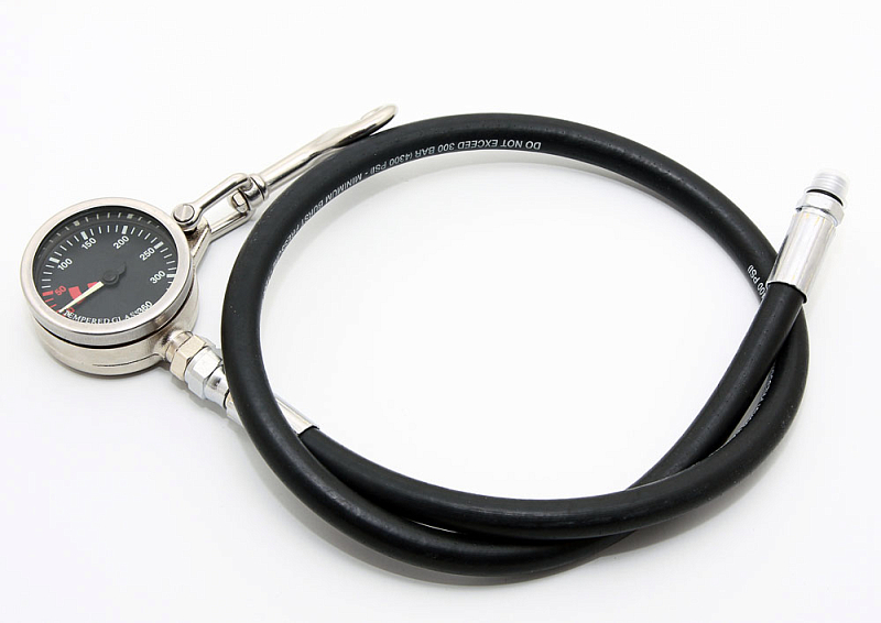 Специальное ухо позволяет крепить к манометру карабин, а тот в свою очередь крепится к подвесной системе компенсатора плавучести.