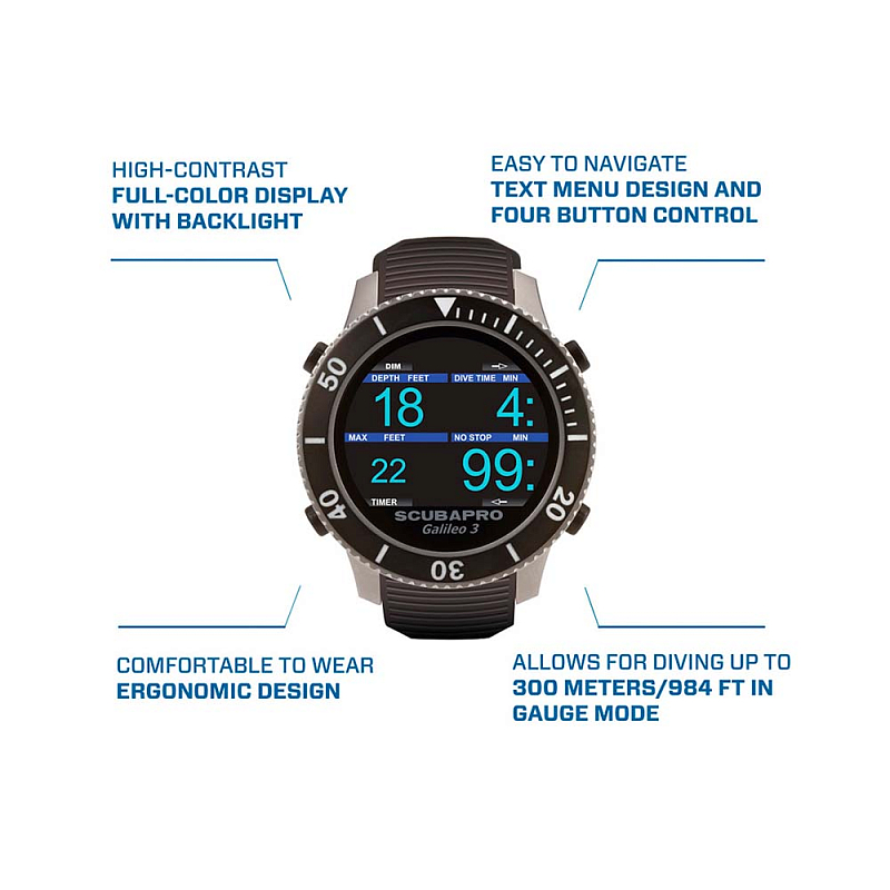 Новый Galileo 3 предлагает все возможности и функции подводного компьютера нового уровня, а также полный набор функций хронометража для ежедневного использования на поверхности. Корпус и безель изготовлены из нержавеющей стали и рассчитаны на глубину до 300 м, а линза — из сапфирового стекла, обеспечивающего исключительную твердость поверхности и устойчивость к царапинам.