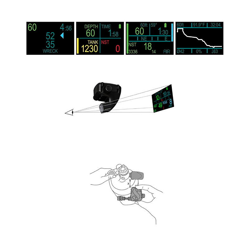 · режимы: Scuba (открытый цикл), ССR (замкнутый цикл), Apnea(фридайвинг), Gauge (измерительный прибор)